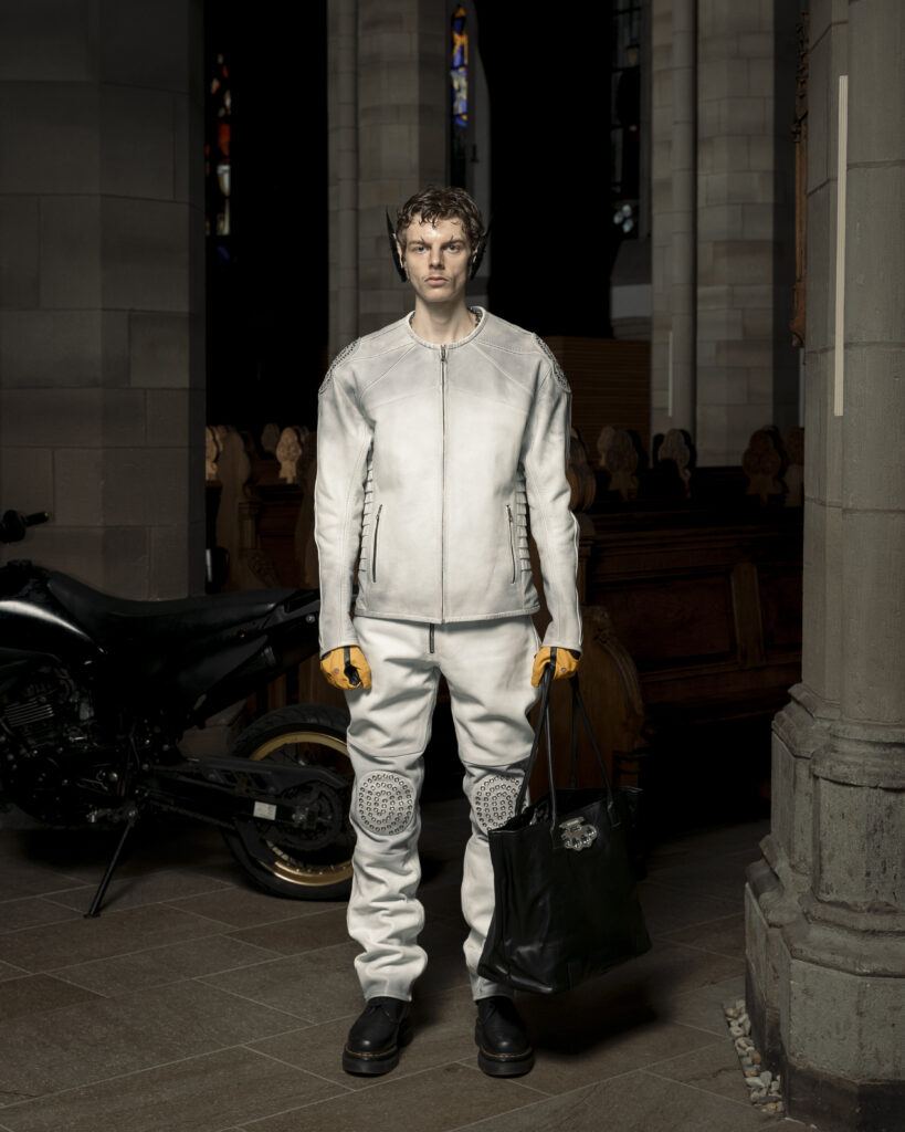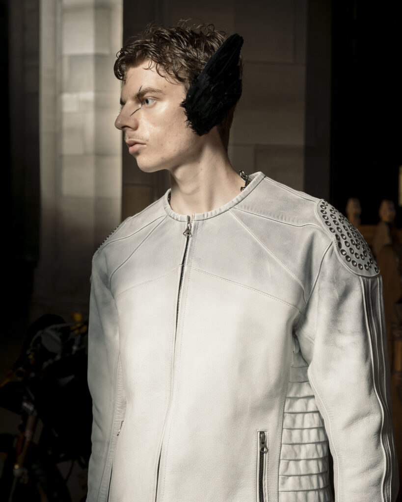 PREMIUM COWHIDE MOTO JACKET WITH EMBOSSED “FACE” LOGO ON THE BACK AND POLISHED SURFACES. GEOMETRIC PANELS ON THE SHOULDERS AND SIDE FRONT WITH TOP STITCHING. HORIZONTAL PIPED PLEATS ON THE SIDE, FULL-LENGTH FRONT ZIPPER, HIDDEN POCKET ON THE BACK, CUFF WITH SIGNATURE ZIPPER, ZIP POCKET AT FRONT AND INSIDE, SHOULDER PATCHES WITH EYELETS, TONE IN TONE LEATHER STRIPES ON THE SLEEVES.