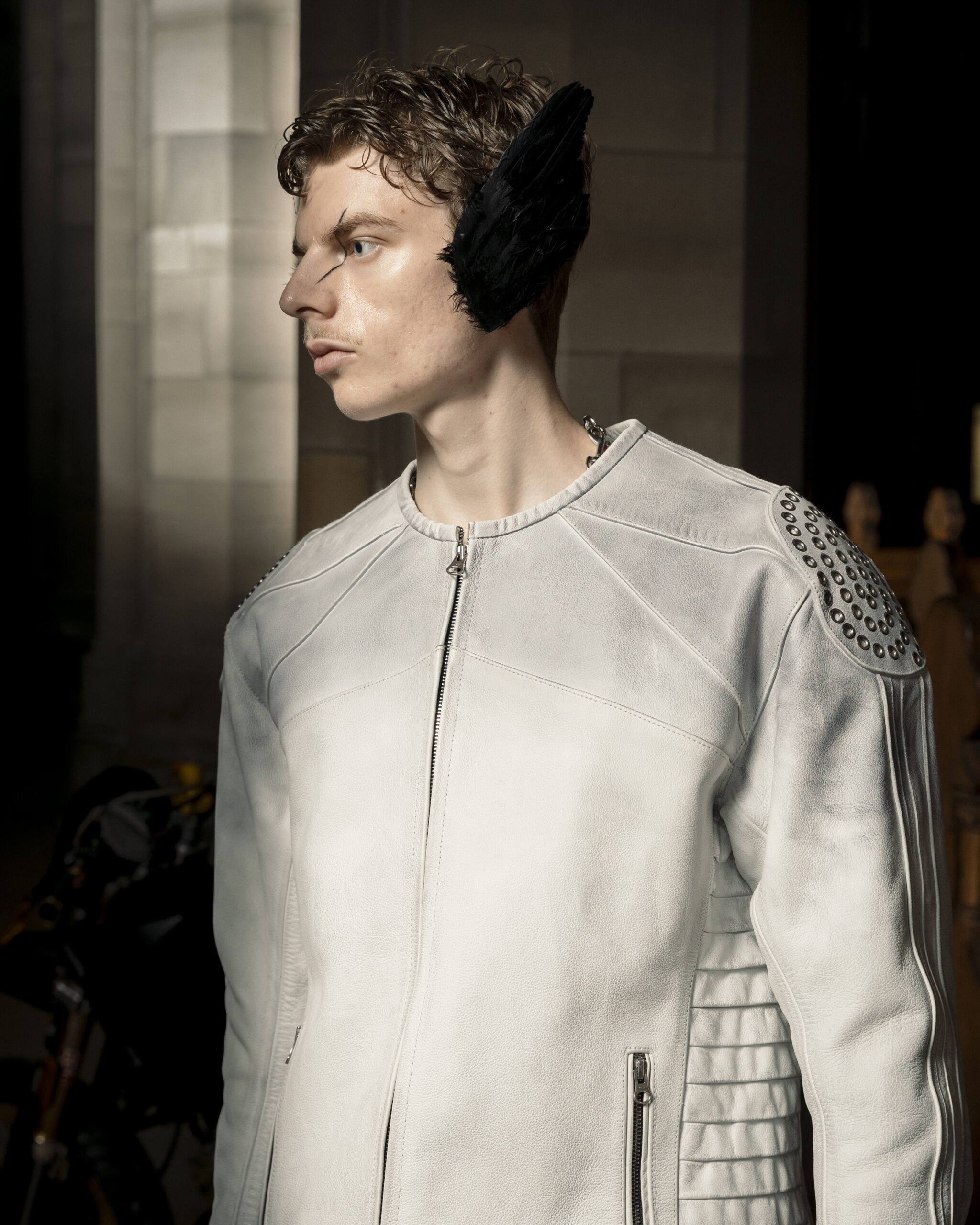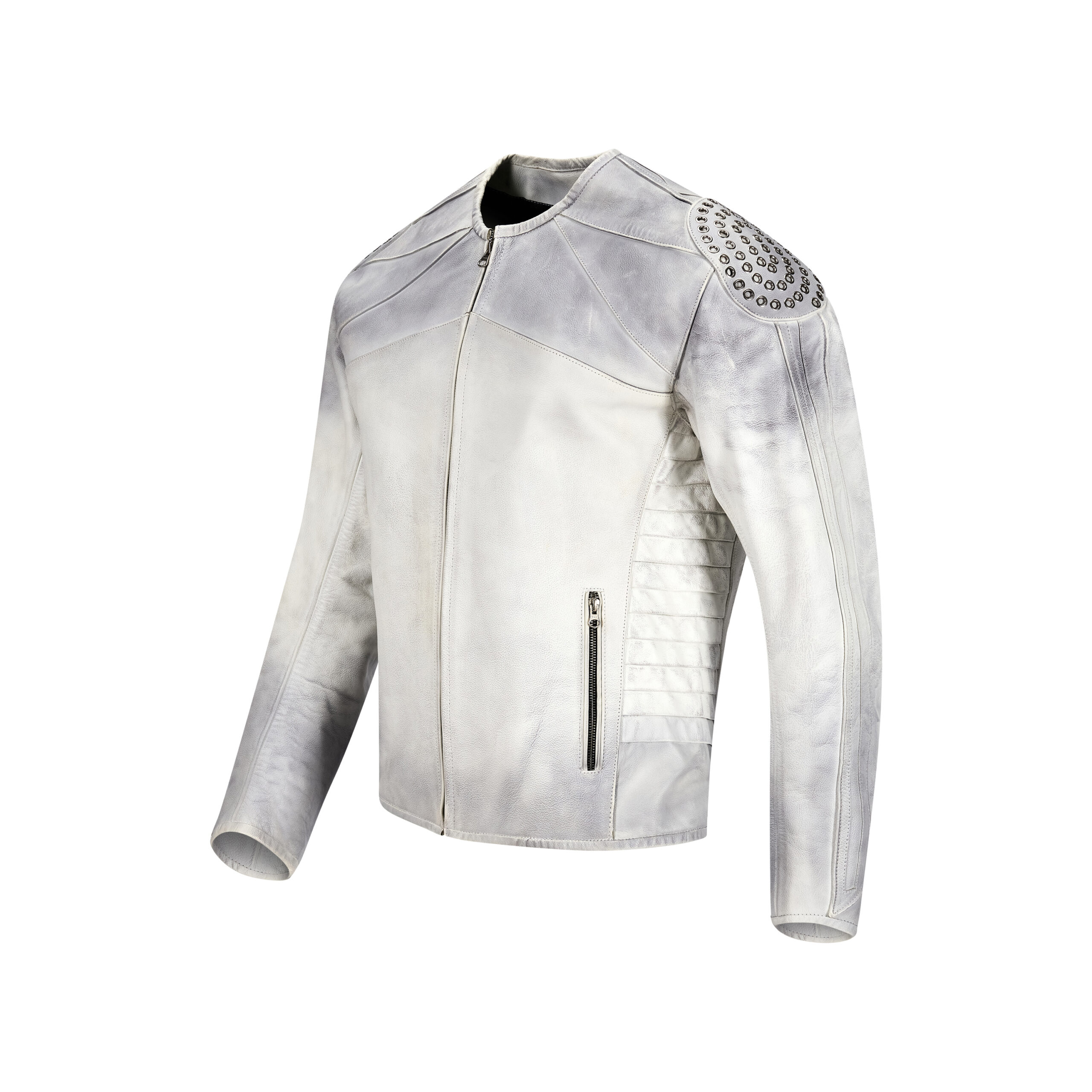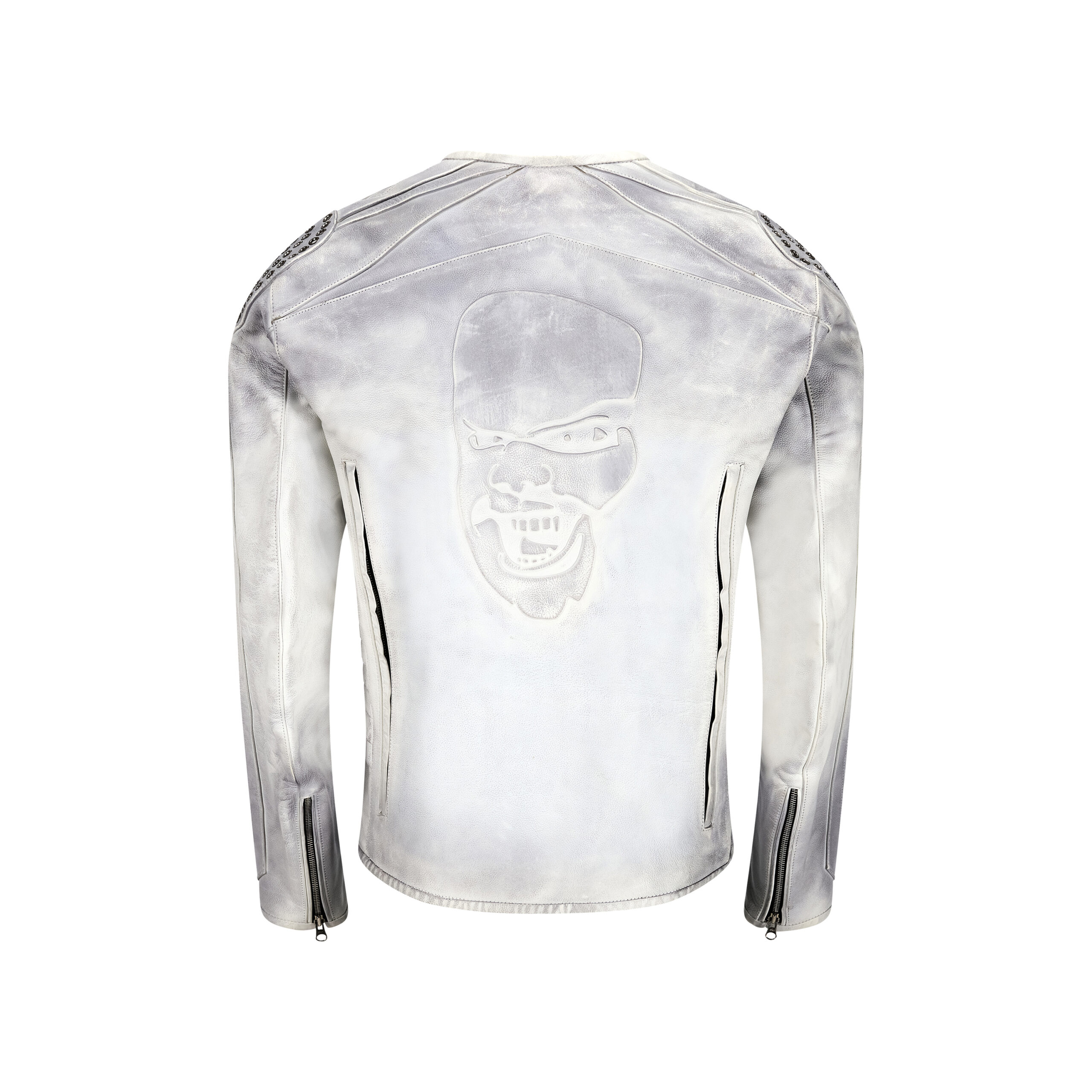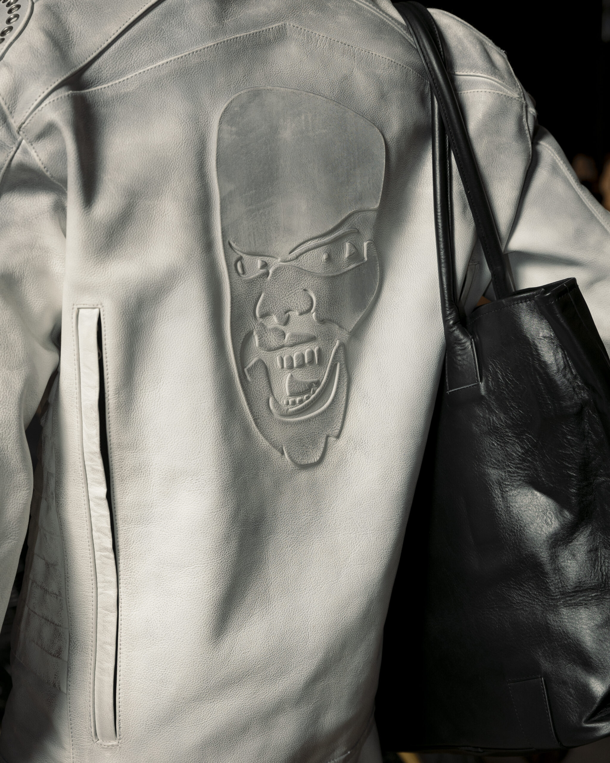 PREMIUM COWHIDE MOTO JACKET WITH EMBOSSED “FACE” LOGO ON THE BACK AND POLISHED SURFACES. GEOMETRIC PANELS ON THE SHOULDERS AND SIDE FRONT WITH TOP STITCHING. HORIZONTAL PIPED PLEATS ON THE SIDE, FULL-LENGTH FRONT ZIPPER, HIDDEN POCKET ON THE BACK, CUFF WITH SIGNATURE ZIPPER, ZIP POCKET AT FRONT AND INSIDE, SHOULDER PATCHES WITH EYELETS, TONE IN TONE LEATHER STRIPES ON THE SLEEVES.